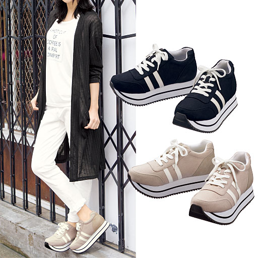 今季人気のスニーカーは、スタイルアップが叶う厚底が決め手!2本のラインがスポーティー。パンツにもスカートにも合わせやすい1足で、ブラックとグレーの使い回しの効くカラーが揃ってるよ♪