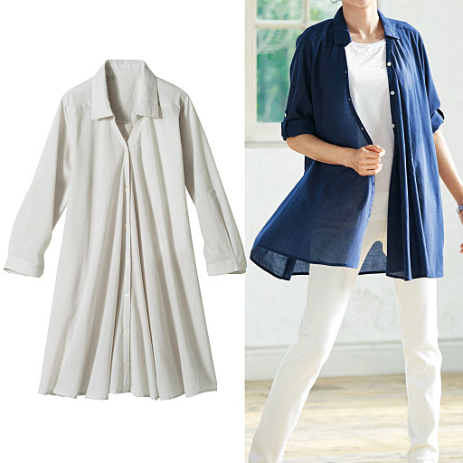 やや薄手でやわらかな綿100%カルゼ素材を使用し、体型をカバーできて大人っぽいフレアシルエットで、袖はロールアップもOK。