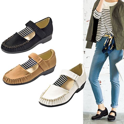 ゆったりモカシンに甲ベルトをプラスした履きやすい仕様。